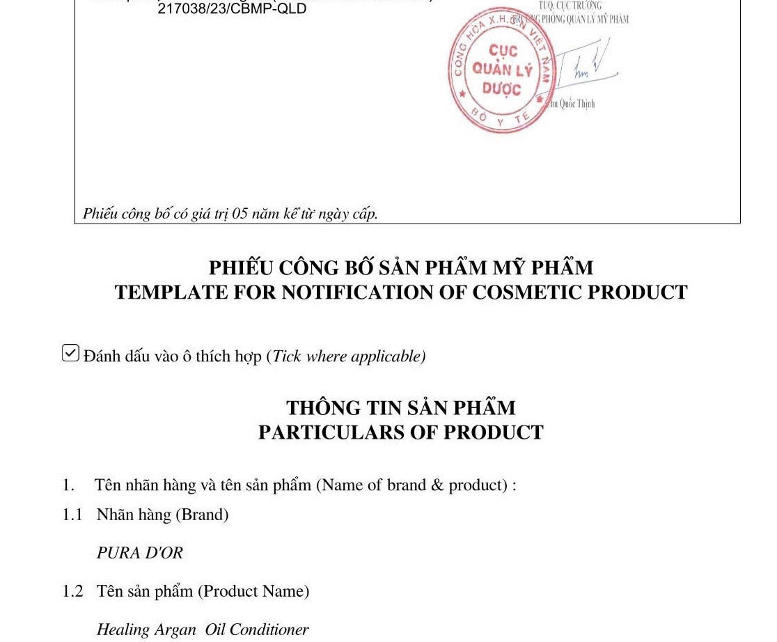- Phiếu công bố mỹ phẩm (02 bản).